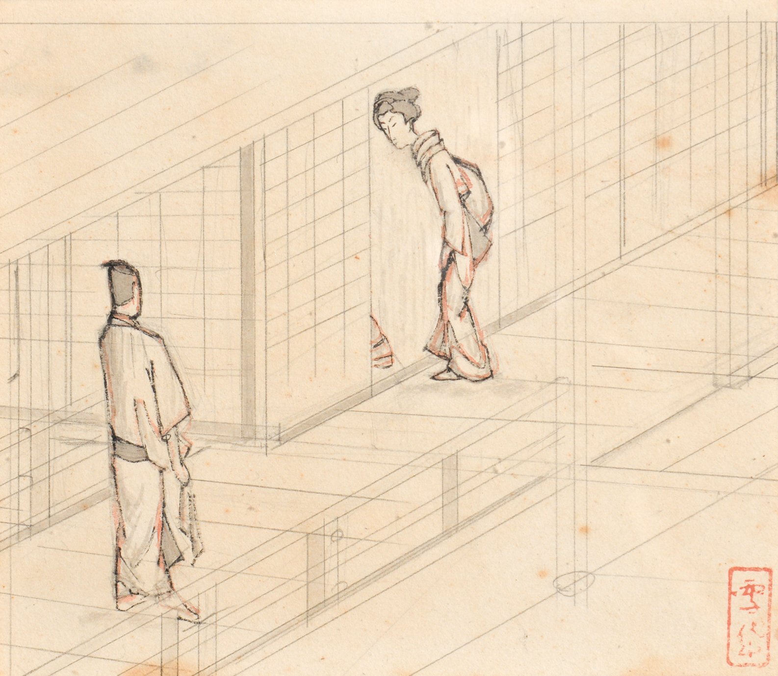 紙に鉛筆・朱線